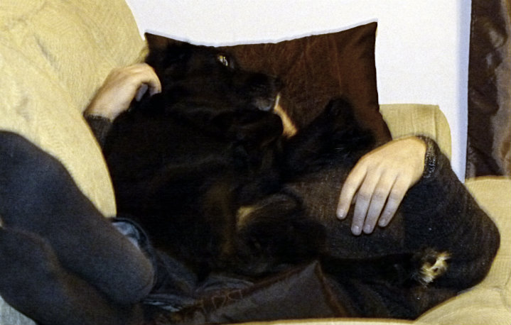 Still, I suppose it was worth it… he does talk to me and he doesn’t mind proper cuddles. Or if he does, he’s laughing too much to stop me. He even gives me cheese. Though why he has to go wash his face when I’ve done it for him I’ll never know…