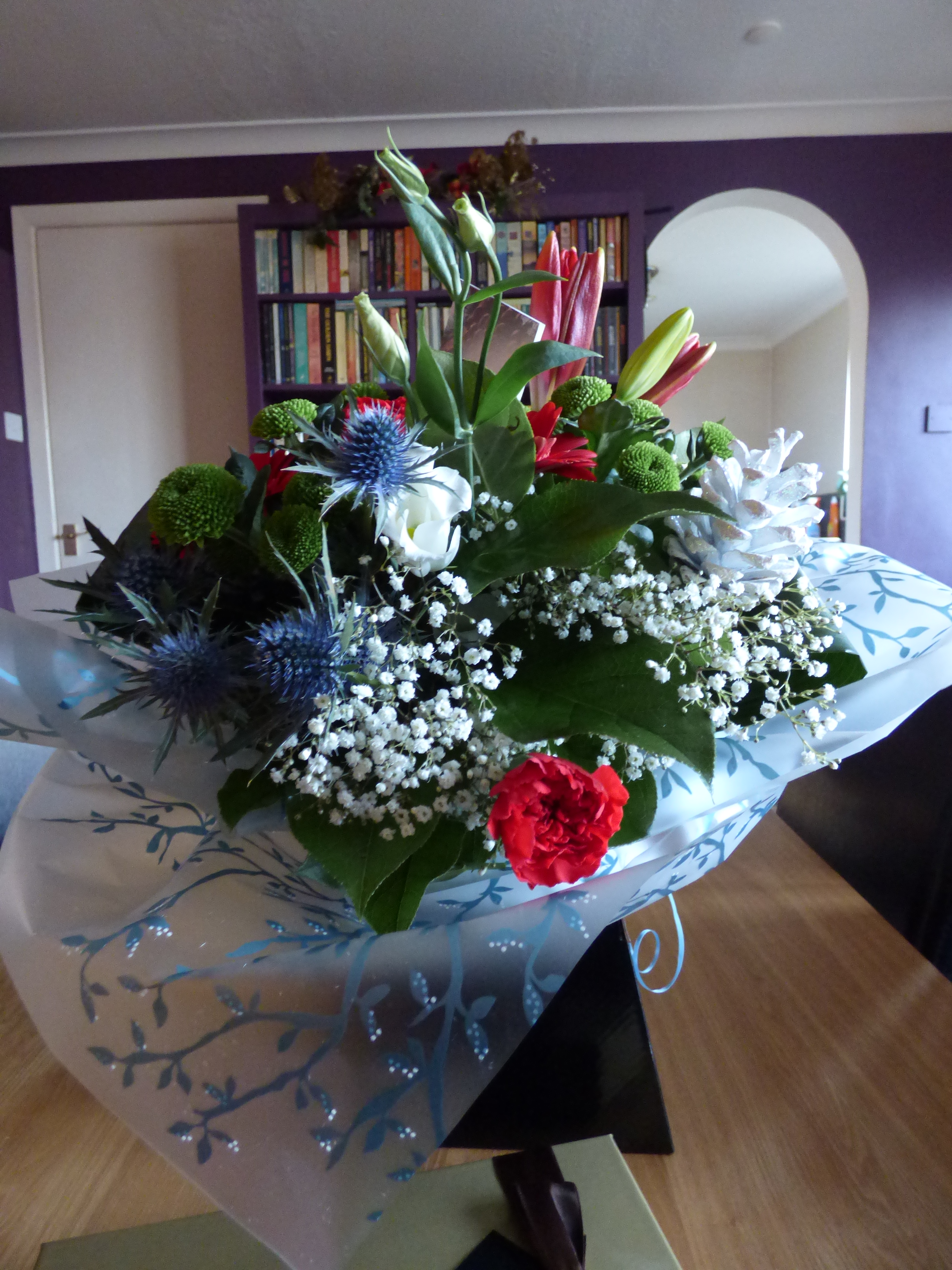 Ani barked… she sometimes does when I am leaving and I was heading to the village shop, my arms were full of stuff to take out to the car and I struggled to open the door… only to be met by a bouquet of flowers hovering in mid-air… accompanied by an apparently disembodied voice asking if I was Sue.