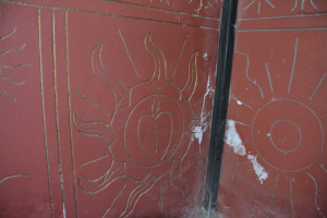 I had to crouch down to get the shot of the ancient sun, above. These wonders of ancient history occupy a very quiet place on Caldey Island, one I had stumbled across eight years ago, when we paid our first visit here. Then, the twenty or so plaster (reproduction) engravings were simply white and dusty and looked very neglected. Since then, someone has lovingly decorated them in red and gold.