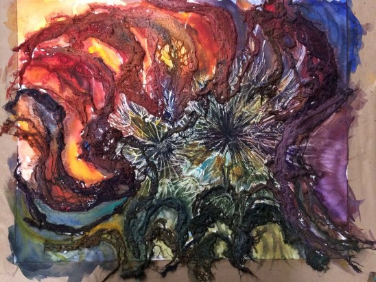 I enjoyed the sentiments which gave a deeper richness to the art. It is a quandary, that. Which comes first the art or the associated feeling? Did I feel this before I saw it, and only once witnessed, in the “layering frisket, cheesecloth, watercolour, acrylic like so many layers of soil over seed” could I recognize the bloom that was planted. Much to say, but really, your words and art say it all.