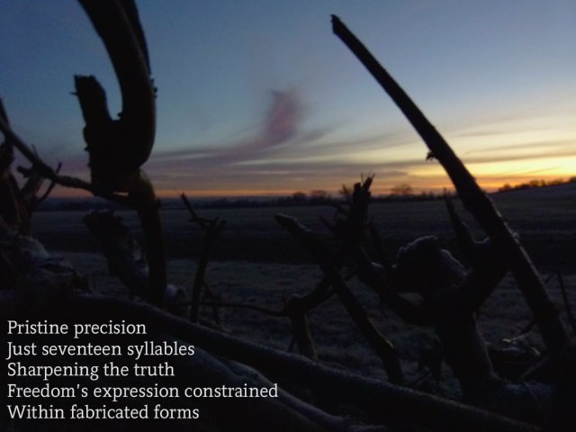 I enjoy writing haiku. The ‘midnight haiku’ I started publishing a couple of years ago now have become a staple feature of the blog and I think I have missed no more than a couple of days in that time to illness. I like the constraints imposed by the widely accepted ‘English form’ of the poem; seventeen syllables in a 5-7-5 pattern leave no room for extraneous thoughts, but give plenty of space to explore ideas.