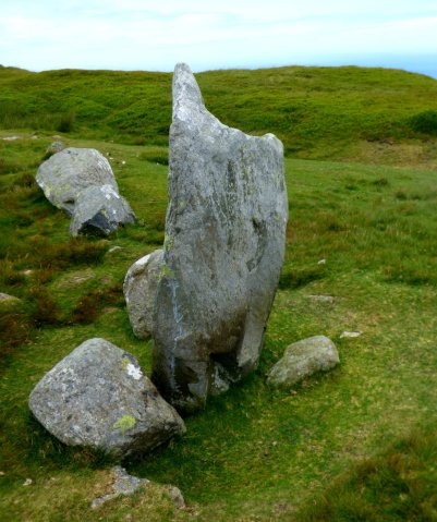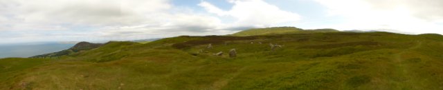 You could not wish for a more spectacular setting for a stone circle. Perched high above the sea, with views to distant mountains in every other direction, it is a magnificent site. A slight rise to the seaward side blocks the view of the modern quarrying and, from within the circle, there is no visible trace of the modern world at all.