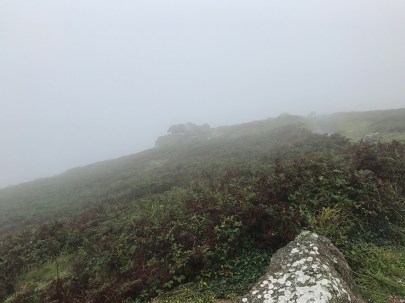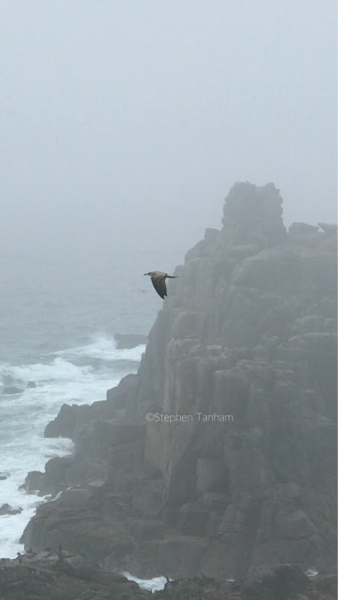 The kindly man with a right arm full of tattoos takes our six pounds for the car park fee, and suggests that, in view of the thick mist, and our early arrival (there are only three other cars in the Land’s End parking area) we might like to explore the southern loop of paths and the artisan workshops before returning to the main buildings, which by then will be open…