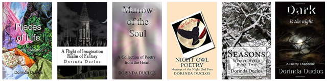 Dorinda Duclos is a writer of poetry, sharing her life experiences in verse. She is also the author of the blog, Night Owl Poetry, and has amassed a following of fellow poets, writers and artists, and is highly recognized in social media. She is a member of the Poetry Society of America and the Academy of American Poets, as well as a guest writer on PoetsCornerBlog.wordpress.com