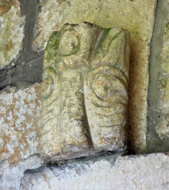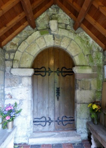 The old door of the church is set beneath a plain Norman arch, with a human head as its keystone that is sometimes described as a bear. The supporting corbels are also carved… one is now too worn to identify, but the other is a ‘beaked head’ which looks rather draconine.