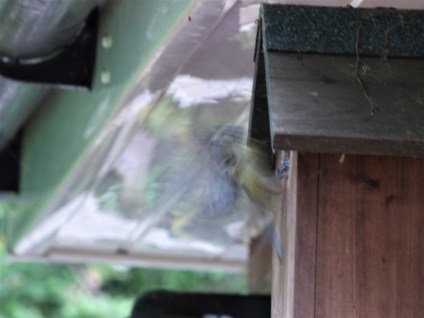 Even so, we have watched the nests nervously. We’ve chased the crows away from the magpies, the magpies and cats away from the nestbox and live in hopes for all of them. Every day, I check the nestbox from a distance, hiding behind the trellis to make sure that the parent birds are still tending the nest. A few days ago, I thought all was lost when I came down to find the nestbox knocked out of place and sitting at an angle. Surely the birds would have abandoned it, especially as the same thing had happened last year, leaving the lifeless nestlings strewn across the ground. Keeping my presence minimal, I straighened the box and withdrew. I saw no activity for a couple of days and concluded the worst; the little bluetits had gone. And then, photographing the roses, I caught the blur of motion. The parent birds were in and out all mornng, evidently busy with a breakfast that merged into lunch.