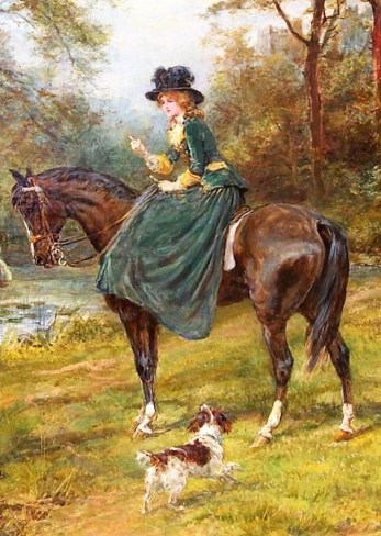 “Of course you can.” The Lady replied, and pulled her to her feet. Mary now realised that the Lady was dressed very oddly. She was all in green, in a long old-fashioned riding dress. She put one foot in her stirrup and pulled herself up on the saddle. Seated side-saddle she bent down and pulled Mary up onto her lap, she was certainly very strong. They cantered down the ride, Mary felt completely safe and very happy.
