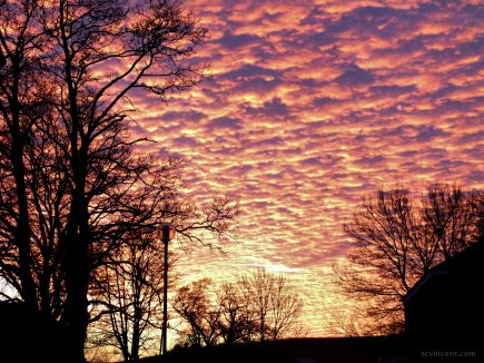 For visually challenged writers, the image shows a mass of dawn clouds in gold and purple against the bare branches of winter trees..