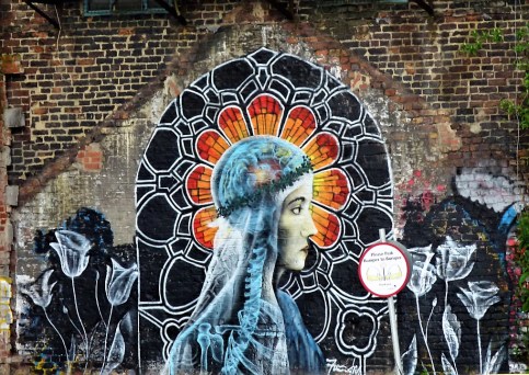 For visually challenged writers, the image shows a piece of street art; a woman, veiled and crowned with greenery, shown in profile. She is painted against a holo of flame colours with a stained glass winddow effect and surrounded by white flowers on a black background. The woman is painted as transparent, showing her skeleton and brain through the flesh. The brain glows from within, and appears tohold figures…