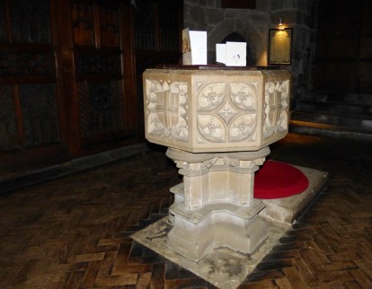 The font is one of the first things you notice. Like the Cross in the village, it is octagonal, but where the Cross is plain and simple, the font is richly carved and dates only to the nineteenth century.