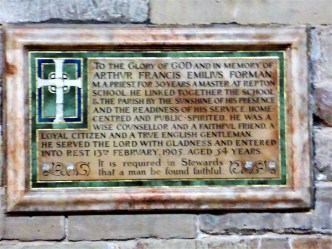 There is a rather endearing plaque to a priest and schoolmaster, who linked church and parish ‘by the sunshine of his presence’. Another, to a headmaster of the school, mentions his ‘strict, but kind administration of his trust’ and ‘the respect and affection of his scholars’. This is a blatant example of how the truth of history can be perverted, for the same master was ‘a big, bullying man, a strict disciplinarian and ferocious flogger’. When the boys heard of his illness, they went wild, broke out of school in search of ale and cake, and, at his death, smashed furniture. Not a great legacy of ‘kindness’ and ‘trust’…