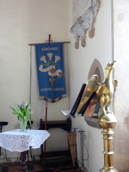 On the other hand, it is plainly a much-loved and well used part of the community, with children’s areas, and displays of childish arts and crafts sitting side by side with memories of older times. The Roll of Honour, surrounded by poppies and painted and inscribed pebbles, sits above the wheeled bier used to bring the coffins of the dead to the altar. The banner of the Mother’s Union sits against the wall, and the octagonal font that has baptised parishioners for the past six hundred years still waits to serve the villagers beneath its seventeenth century cover.