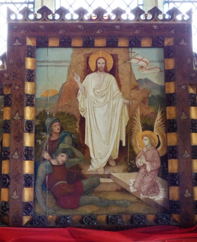 That same cycle is played out symbolically in the beautifully painted reredos. The three scenes show the birth of Jesus, the Resurrection and the Ascension.