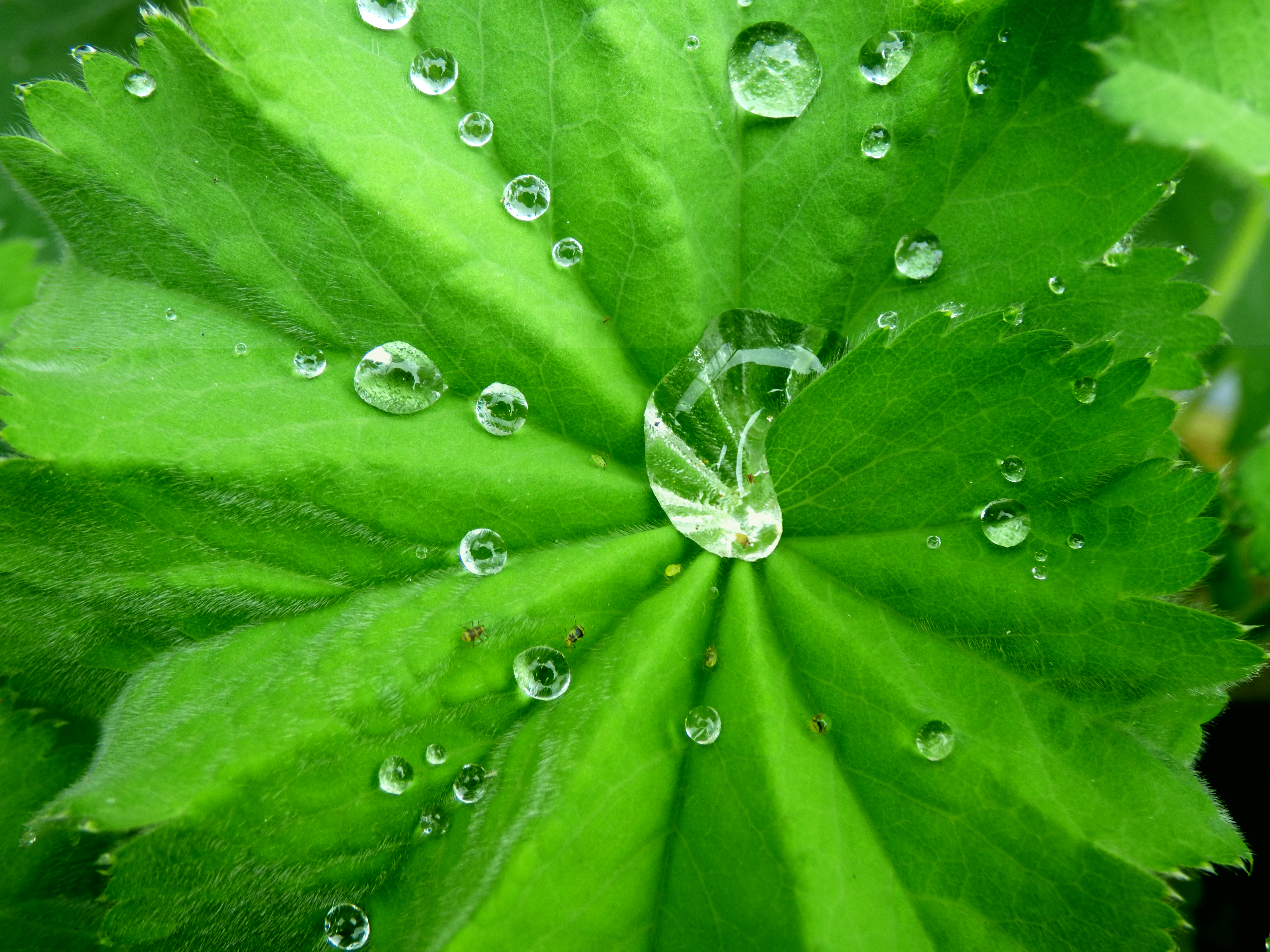 I love Lady’s Mantle… Alchemilla mollis… the soft little alchemist. The shape and gentle shade of the downy leaves and the pale froth of yellow-green flowers. It is a lovely thing in my eyes. Yet it is not till the rain falls on the upturned leaves that you see its full beauty. Tiny creatures are caught in the water droplets, magnified into strange shapes. The water looks like ice, the surface tension palpable. I am reminded of the movement of mercury. Diamond-bright spheres nestle in the folds like so many crystal balls and the child who gazes into them can see worlds and dreams unfold there.