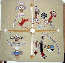 “Once there, they found many animals that were at war with one another. Coyote also lived there. He traveled in the four directions of the four winds and saw that the beings who lived there were not happy and wanted to leave the Blue World. This he told First Man.