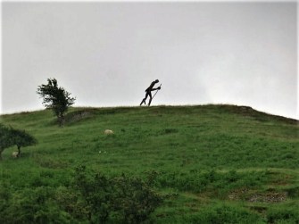 For visually challenged writers, the image shows a green hill against a misty, grey sky. Across the top of the hill strides a strangely proportioned figure. His head is bowed and he is carrying a staff.