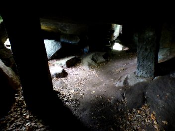 The picture shows a flight of stone steps that rise from a level shelf with three caves, up through the earth to a rocking stone. The steps are very difficult to ascend, being uneven, narrow and high. They lead up from a pitch-dark chamber with a tiny hole pierced through its walls… and amazing acoustics.