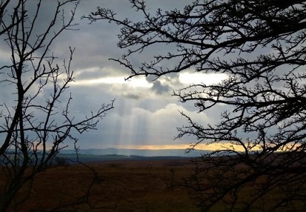 For visually challenged writers, theimage shows a barren landscape against the shadows of distant hills. Bare branches reach towards each other, framing the scene, while shafts of light stream through a golden window in the dark, cloudy skies.