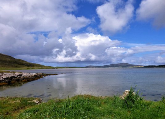 For visually challenged writers, the image shows a bay with clear, glassy water, reflecting bue sky and clouds. The bay is surrounded by green hills, one of which may be an island in the distance…