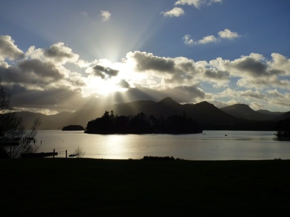 For visually challenged writers, the image shows the dark silhouette of an island in a shimmering lake, surrounded by shadowy hills. The sun is breaking out from behind the clouds in rayed splendour.