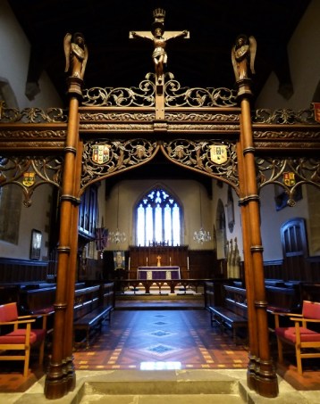 The chancel is unusual, wider than the nave itself and now separated from the body of the church by a carved screen added in the early twentieth century. It is a simple sanctuary when compared with the brilliance and colour of the nave and is watched over by a Green Man carved on one of the old pillars.
