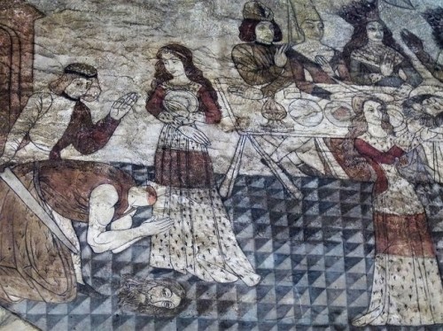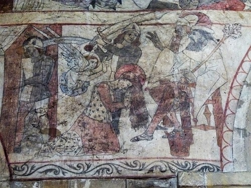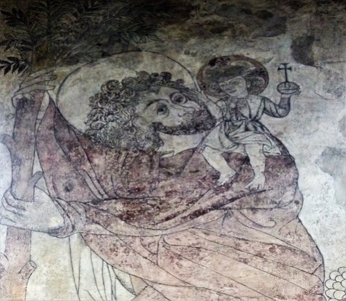 The church has to be seen in person to appreciate the scale and complexity of the paintings, from the repetitive detail of the tiled floors in King Herod’s banqueting hall, to the jewels and costumes of the characters so vividly depicted, to the smile on the face of the eel that wraps itself around the leg of St Christopher as he carries the Child. All are depicted in mediaeval dress… ensuring that their status would be understood by the unlettered worshippers within the congregation, who could learn the stories of the saints and of the Christ simply by raising their eyes.