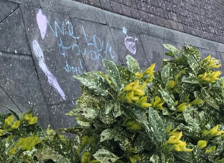A couple of doors down from my home, another set of grandchildren have found a novel way of making their grandparents smile. Their message has survived both frost and rain and it warms my heart every morning when I see it… and it must do so much more for the couple for whom it was intended. “We love you and miss you both” is chalked, in a child’s handwriting, on the pavement right outside the door.