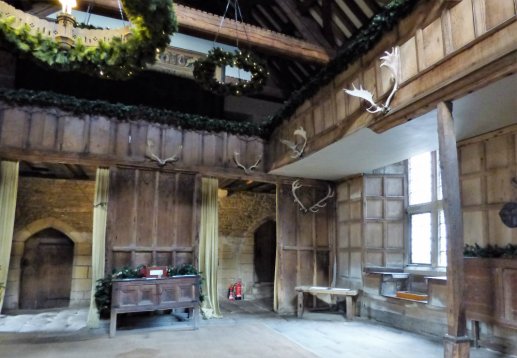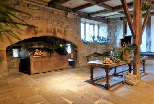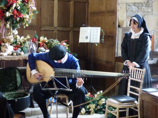 When we visited Haddon Hall, the place was decked for Christmas. Roaring fires blazed in many of the great hearths, filling the air with the fragrance of woodsmoke and home. There were Christmas trees in every corner, covered in natural decorations, with garlands of dried orange slices adding their zest to the scent of pine. The Great Hall, where a huge fire blazed, was hung with garlands of greenery and the high table on its dias was piled with flowers, fruits and festive cheer.  I would have loved to go up into the minstrels’ gallery and look down upon the scene… but we were at least able to look back somewhat down the years as a lutist and singer recreated the music of a Tudor Christmas.
