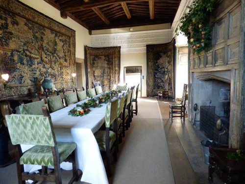 The ‘modern’ dining room, its great table a copy of the far older one in the Great Hall, was added in 1500 by Henry Vernon. The ceiling is painted in a chequerboard of black and white squares, with Tudor roses and the Talbot dog, the emblem of  Vernon’s wife, Anne. The warm oak panelling was added forty-five years later and is carved with the Boar’s Head crest and the arms of the family. Over the fireplace, the royal coat of arms is carved above a motto which reads, ‘Drede God and honor the Kyng’.