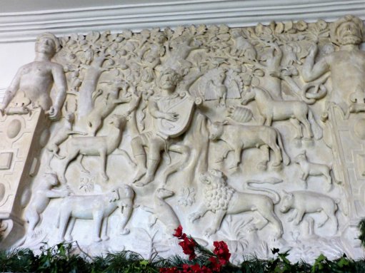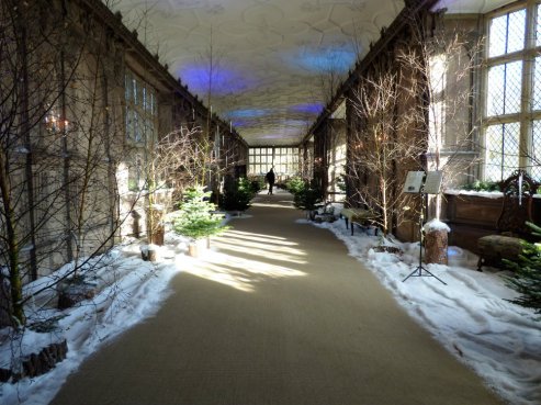 For our visit, the Gallery had become a winter woodland… though I would rather have seen it without the festive flourishes which made it difficult to see the delicately carved woodwork, sporting heraldic peacocks and boars, flowers and love-birds.