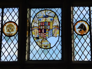 The windows still hold some of the early glass. Here too you can see the peacock and boar crests as well as a shield bearing many armorial details and the date 1589. Glass windows were horribly expensive and would have been the height of luxury at the time. The painted glass even more so.