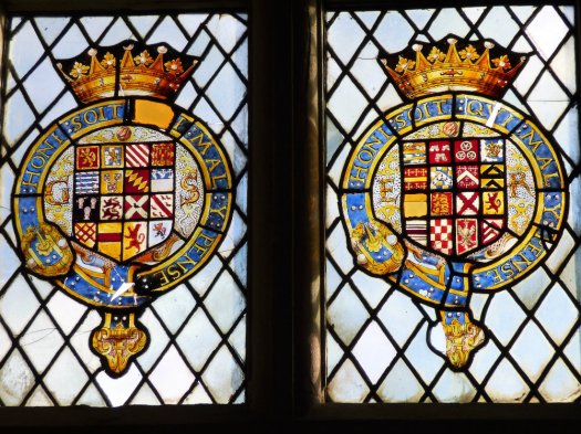 There are also panels showing arms encircled by the Order of the Garter, with the motto ‘Honi soit qui mal y pense‘, ‘shame be to he who thinks ill of it’. Legend has it that the Order was founded when the king was dancing with the Countess of Salisbury and her garter slipped from her leg. Picking up the garter, the king cried the now-famous motto and by some this has been seen to indicate that the Countess’ garter was a symbol of her involvement in witchcraft… though it is perhaps more likely she was involved with the king…