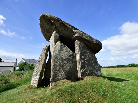 Our next stop was only about half an hour’s drive from the Templar Church, and the road took us through the silent green of Bodmin Moor. With a long drive still ahead, I restrained myself, albeit barely, from turning aside at every interesting signpost, but I was determined to see one of Cornwall’s finest burial chambers… Trethevy Quoit.