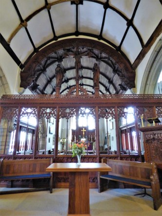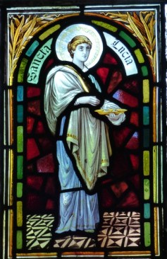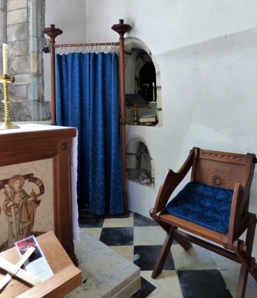 In the Lady Chapel, a statuette of the Holy Mother and Child is flanked by candles and the altar bears finely embroidered saints… Lucy, Agatha and Hilda of Whitby with her snakes. Behind a blue screen, you can still see the old aumbry, where the elements of Communion were kept and the piscina where any surplus holy water was given back to the stone.