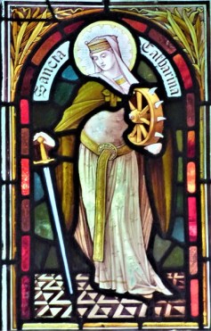 Some, like St Buryan, after whom a Cornish village was named, are ‘local’ saints, while others, like St Margaret of Antioch, with the dragon from whose belly she escaped, are better known. We found many of ‘our’ saints amongst those pictured, those whose names and stories crop up time and again in our research, including St Catherine with her wheel… who had been making her presence felt since our early morning ritual at the Silver Well in Cerne Abbas a few days earlier.
