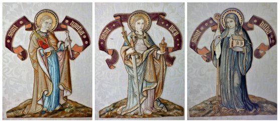 The church is bright and airy. Most of the windows are of largely plain glass, with inset panels depicting female saints and martyrs, accompanied by an angelic orchestra and angels bearing the symbols of sainthood and, for the Virgin Mother, the Crown of Heaven.