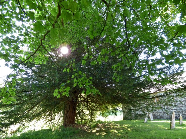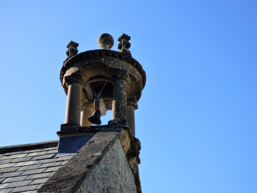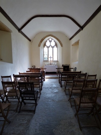 The church is a single-celled building, a mere thirty by twelve feet, topped, incongruously, with a seventeenth century bellcote supported on four pillars and sporting a grotesque mask. This and a handful of gravestones beneath an old yew are the only clue to its presence.