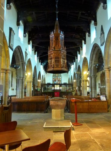 The first thing you see is the original font; plain, unadorned and as old as the church itself. Above it hands an ornate Jacobean cover, carved at around the time the first British colonies were founded in America. Behind it, the base of the tower has been opened up to create a memorial area, flying the colours of the Duke of Wellington’s regiment. A board commemorates the dead of the WWII, while the window pays tribute to those who lost their lives in the Great War.