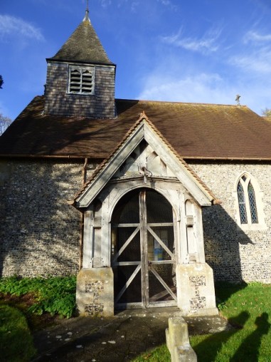 The exterior of the church, built by re-using the flint of its predecessor, has an old timber porch with coloured glass windows and is topped by a bellcote whose medieval framework houses three seventeenth century bells.