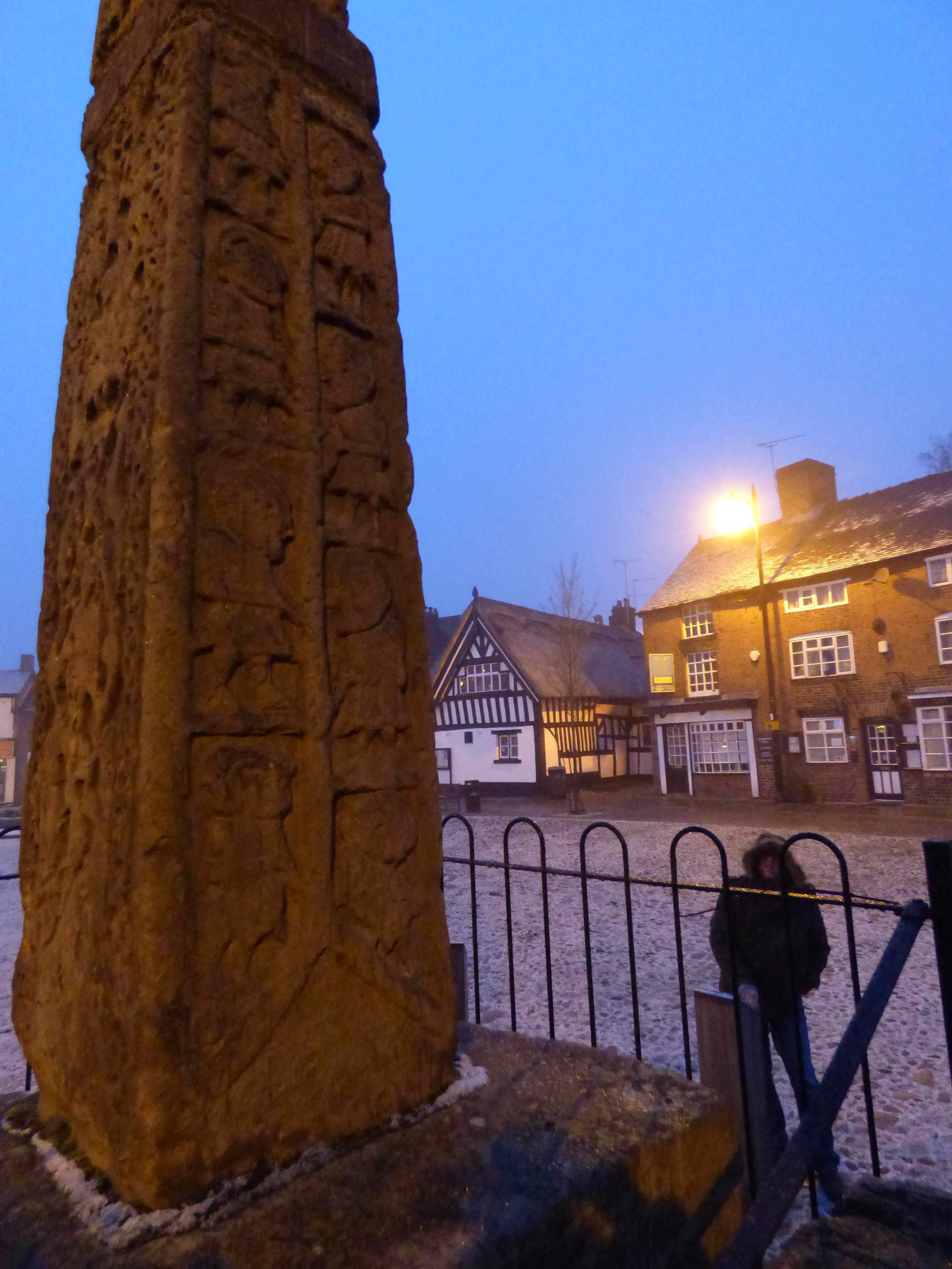 There is a saying that ‘mad dogs and Englishmen go out in the noonday sun’. It was barely daylight, there was no sun, only a thin, white blanket over the world. But our sanity with this trip had already been called into question by a number of our friends, so it came as no surprise that we were out before dawn, all excited, to search the snow-dusted town for a couple of bits of carved stone. Not just any bits, mind you; the Sandbach Crosses are justifiably renowned.