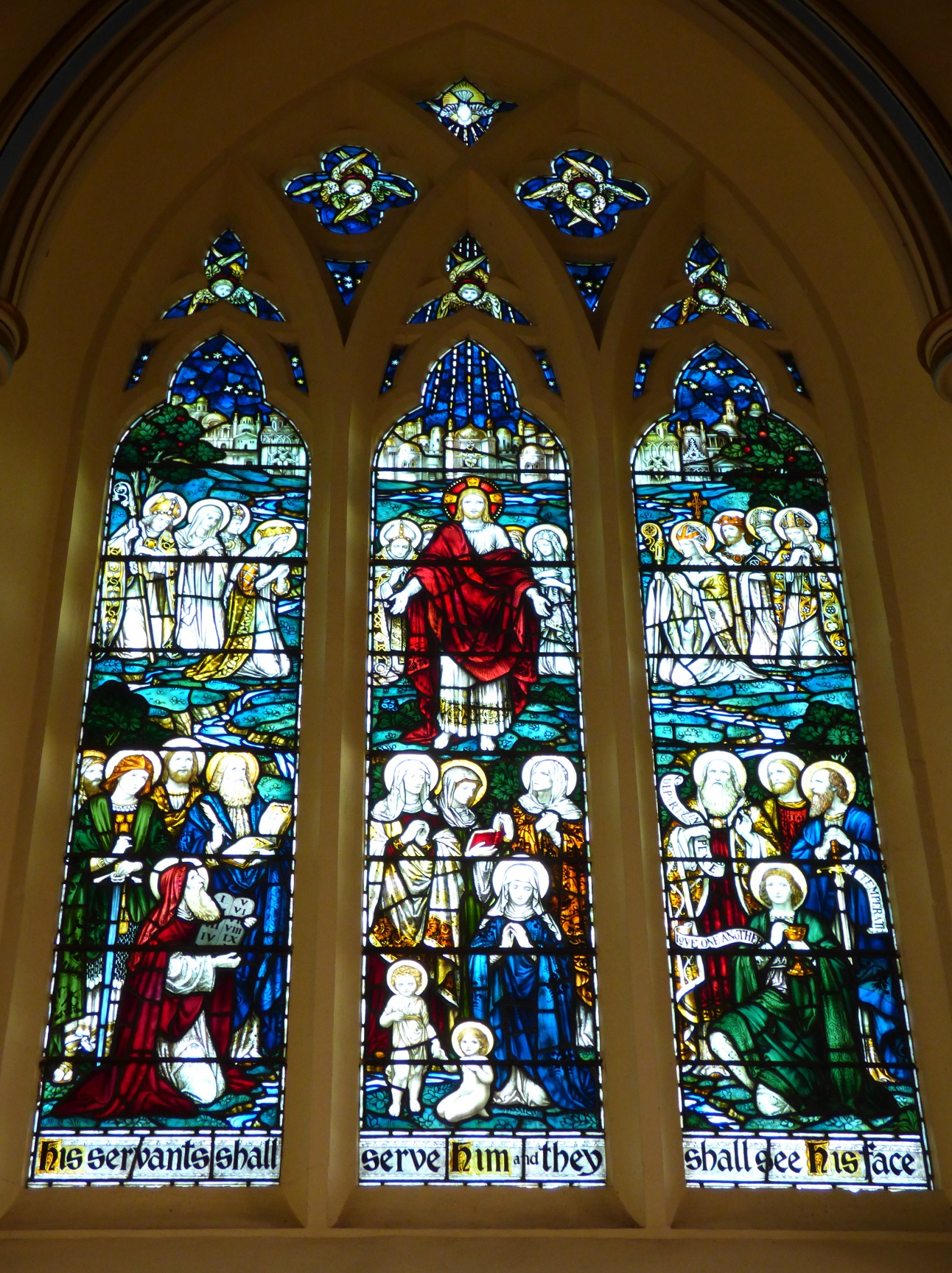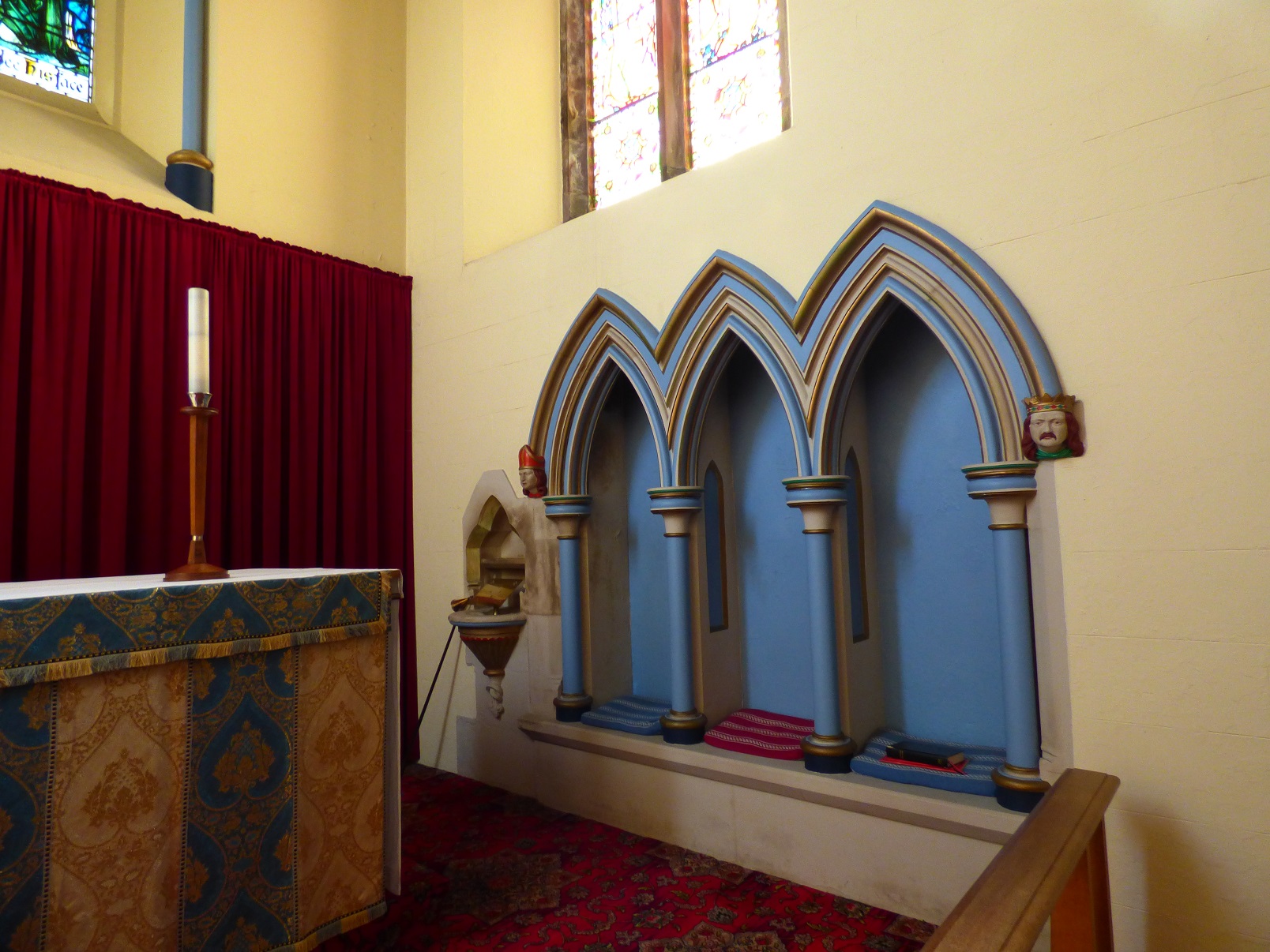 The piscina and sedilia in the sanctuary have been painted and gilded in the manner of the elder days, giving a feel of the light and colour that once reigned in our churches. A side chapel preserved, holding the memorials to the great and good of the area. The stained glass is lovely, and includes a set of windows showing the Canticles… the great songs of the Bible. Which means there was the Nunc Dimitis… which means another Simeon window… remind me to tell you about the Simeon affair one of these days…