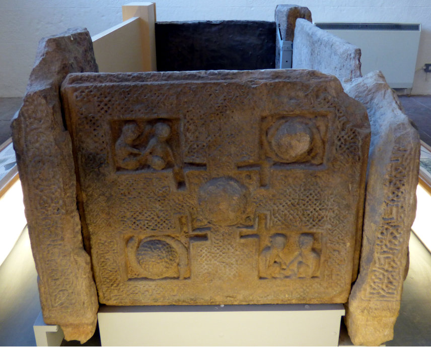 I didn’t know where to begin… My companion headed for the Pictish cross slabs, but the sarcophagus drew me. All I could see of it at this stage was its shape and the end panel, intricately carved with an equilateral cross. In two opposing corners, twin serpents curl around an orb, in the other two twin figures that look like children at play. From here it seemed as if the two end panels might be intact, one side and some of the corner supports.