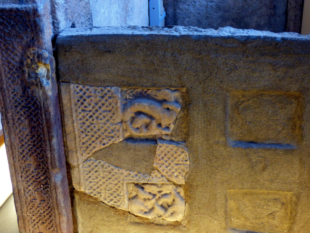 I wandered round to the left towards the more obvious damage, saving what appeared to be the intact side panel for last… like a child eating the cabbage first, as grandma had taught me so long ago, and saving the best bits till last. The boards gave a little history. The sarcophagus had been discovered in 1833 in the abbey precinct, its pieces separated. It dates back to around AD750… the Dark Ages. Yeah right… very ‘dark’ judging by the sophistication of the design and the artistry…