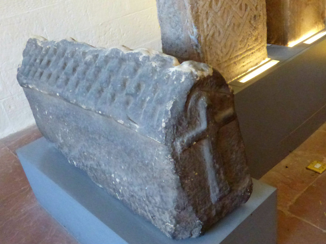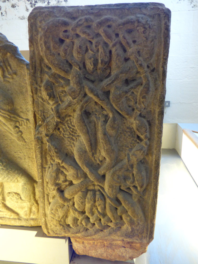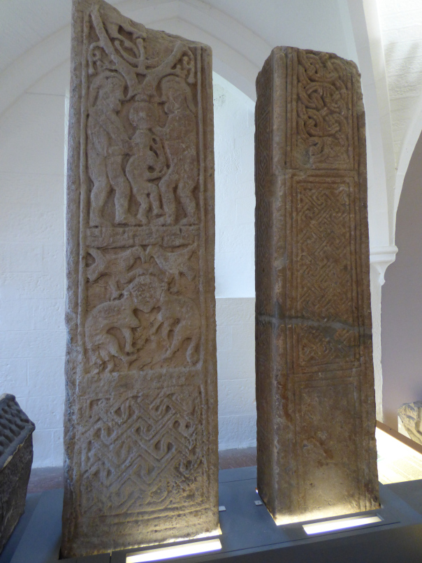 I think both our jaws must have hit the floor as we hit the jackpot. The third room of the little museum seemed to bring together all the threads of the skein that we had been following on our travels. A house-shaped stone… thought to be a grave marker; carved with tiles and looking very like our hogback stones… carved crosses, standing cross shafts… an assortment of heads… and a huge sarcophagus… all just assembled together and waiting for us, while strange beasts and the birds, frozen in stone by the mason’s skill, watched our wonder.