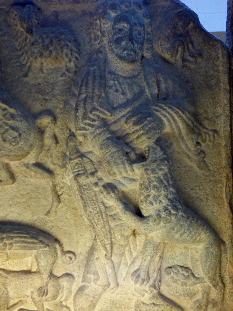 A large imperial figure, dressed like a Roman Emperor serenely holds the jaws of a lion, very reminiscent of the Tarot card of Strength and symbolically signifying perhaps the same thing, at least on one level; the strength of the King to protect his people. In the centre is a hunting scene full of exotic animals… we don’t have monkeys in Britain for a start! A horseman rides amongst the animals and a hunter with a spear. It is an incredible piece of art; the sculpture and still crisp and fresh even after twelve hundred and fifty years.