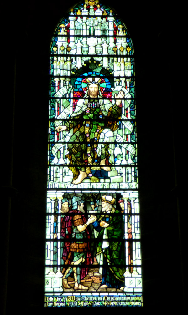 Our St Kentigern was there, under his nickname of St Mungo which means ‘good friend’ or ‘dear one’, a name said to have been given to him by St Serf who cared for him as a child. We’d come across him several times since Aspatria a few days before. There were all the major figures from the Bible including a stunning triple window from 1949 by Douglas Strachan showing David, Moses and Melchizedek.