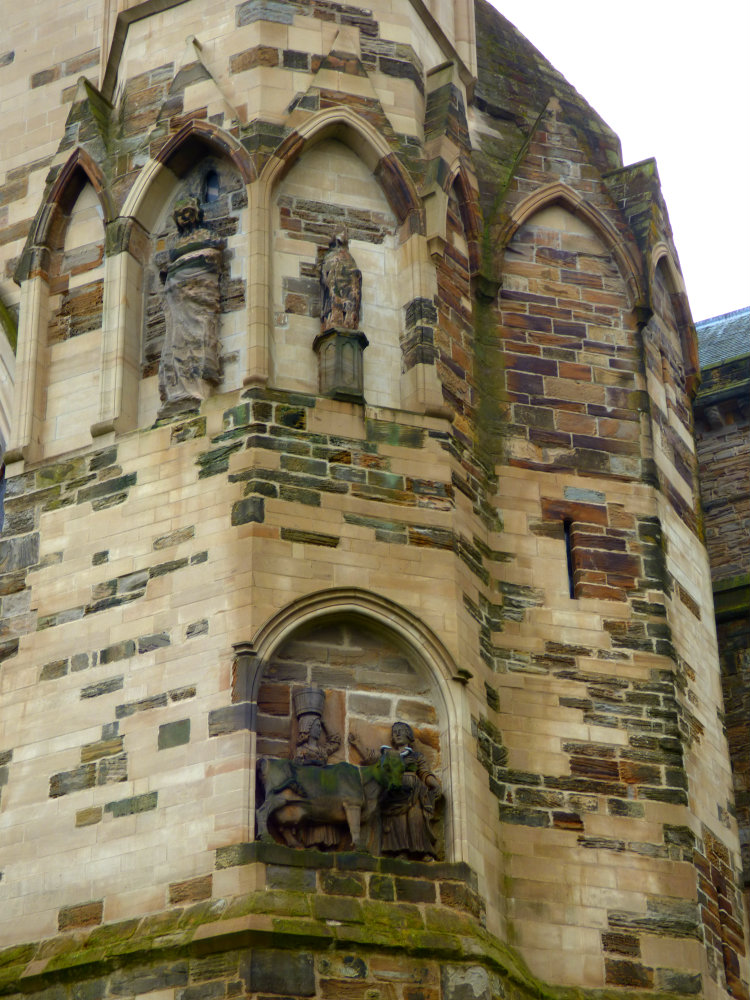 History tells how the relics of St Cuthbert of Lindisfarne were borne with love by his Brethren to Chester-le-Street when the raids of the Danes forced them to flee Holy Island in 875AD, taking the relics with them. A shrine was set up there to the saint, but they were obliged to leave there too in 995. Legend tells they wandered until, following two milkmaids searching for a dun cow, the coffin became immovable. This was taken as a sign that here the new church should be built. On the external walls a carving can be seen of the milkmaids and the cow… and a nearby street bears the name of the Dun Cow.