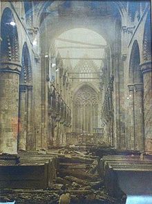 The restoration began. The foundations, laid on a meagre three feet of sand, had caused collapse in 1690. At that time the central tower had collapsed, destroying the south transept, and while the tower had been rebuilt, the transept had remained in ruins. Sir George Gilbert Scott had restored the church in the nineteenth century, but it was not until the fire of 1906 that a complete restoration was undertaken.
