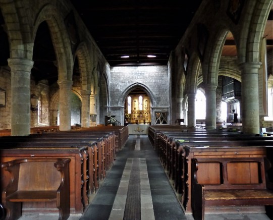 The current church dates largely to the twelfth century. The capital of one pillar bears ornate Norman decoration and the style of the building shows its growth, with rounded Norman arches holding Victorian and modern stained glass beside the windows with later Gothic tracery.