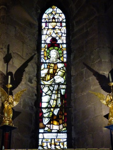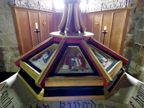 The font is a modern affair, with a highly decorated and unusual cover, showing the offices performed by the priesthood. Whilst its stark colours may grate on modern sensibilities, this bright and ornate style would have been perfect for the early church. In a world where vivid dyes and colour were largely reserved for the wealthy, the churches offered a sacred spectacle to all with wall painted, glass and gilding. The glass in the church is truly spectacular, with a huge amount of windows casting jewelled light through the shadows.